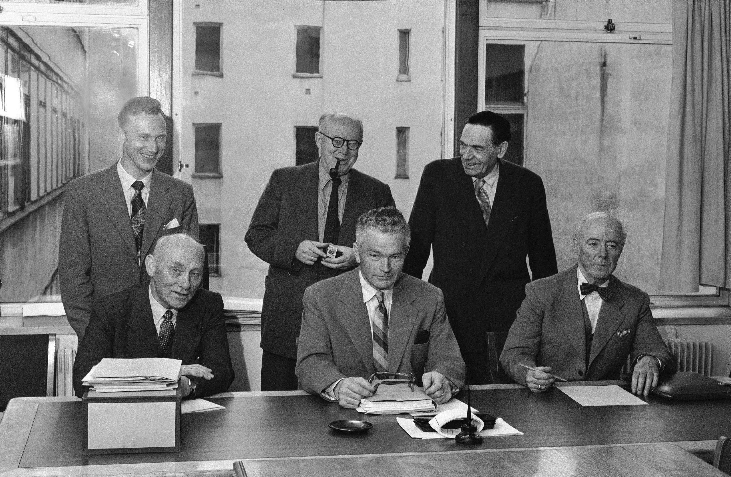 Regjeringen satte i 1946 ned en komité for å justere antallet kommuner i landet. Kommuneinndelingskomiteen ble ledet av Nikolai Schei, fylkesmann i Sogn og Fjordane. Foran fra venstre: Karl Martinussen, Nikolai Schei og Ivar Skjånes. Bak fra venstre: O.J. Svennæs, Jørgen Vogt og Ørnulf Halmrast.