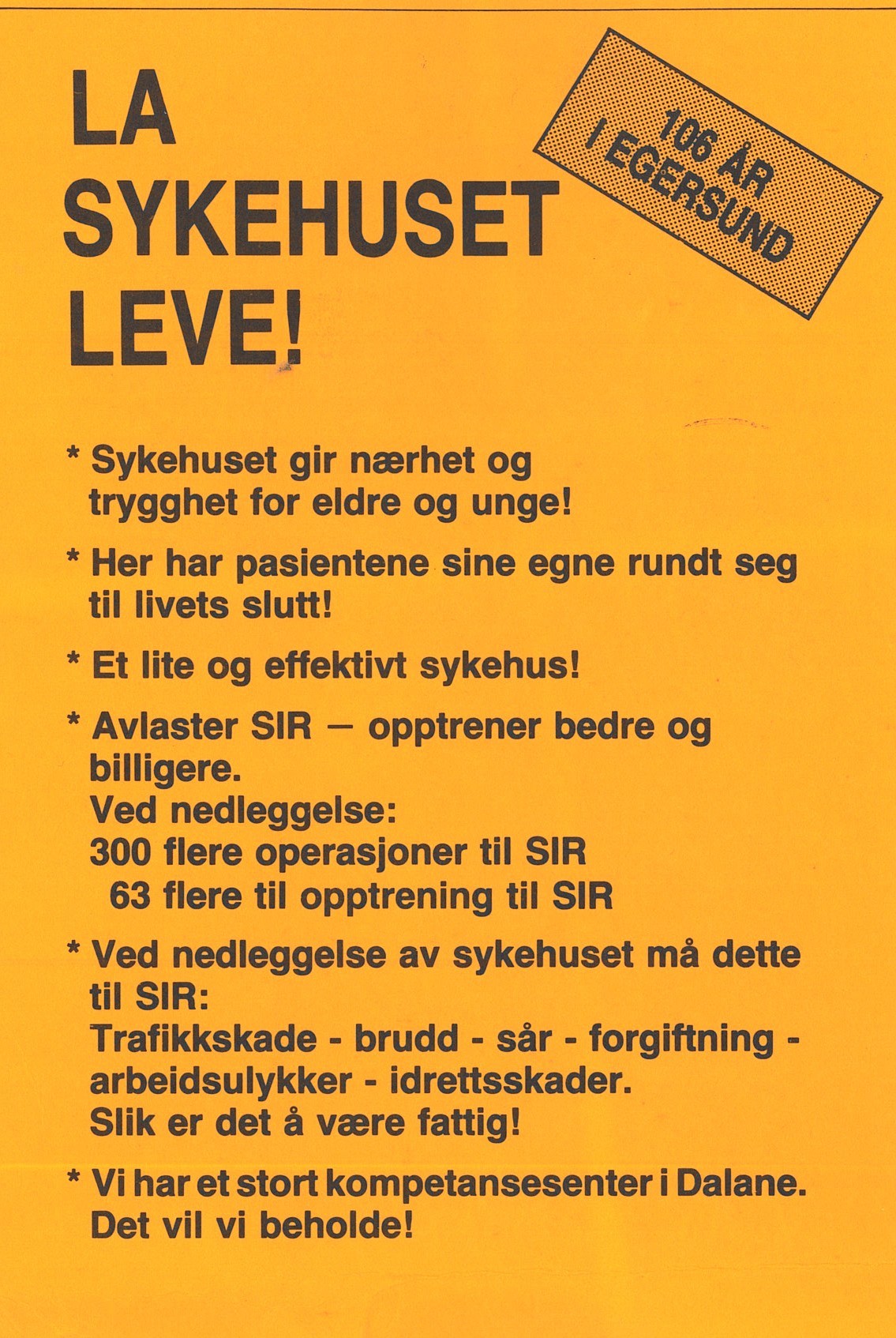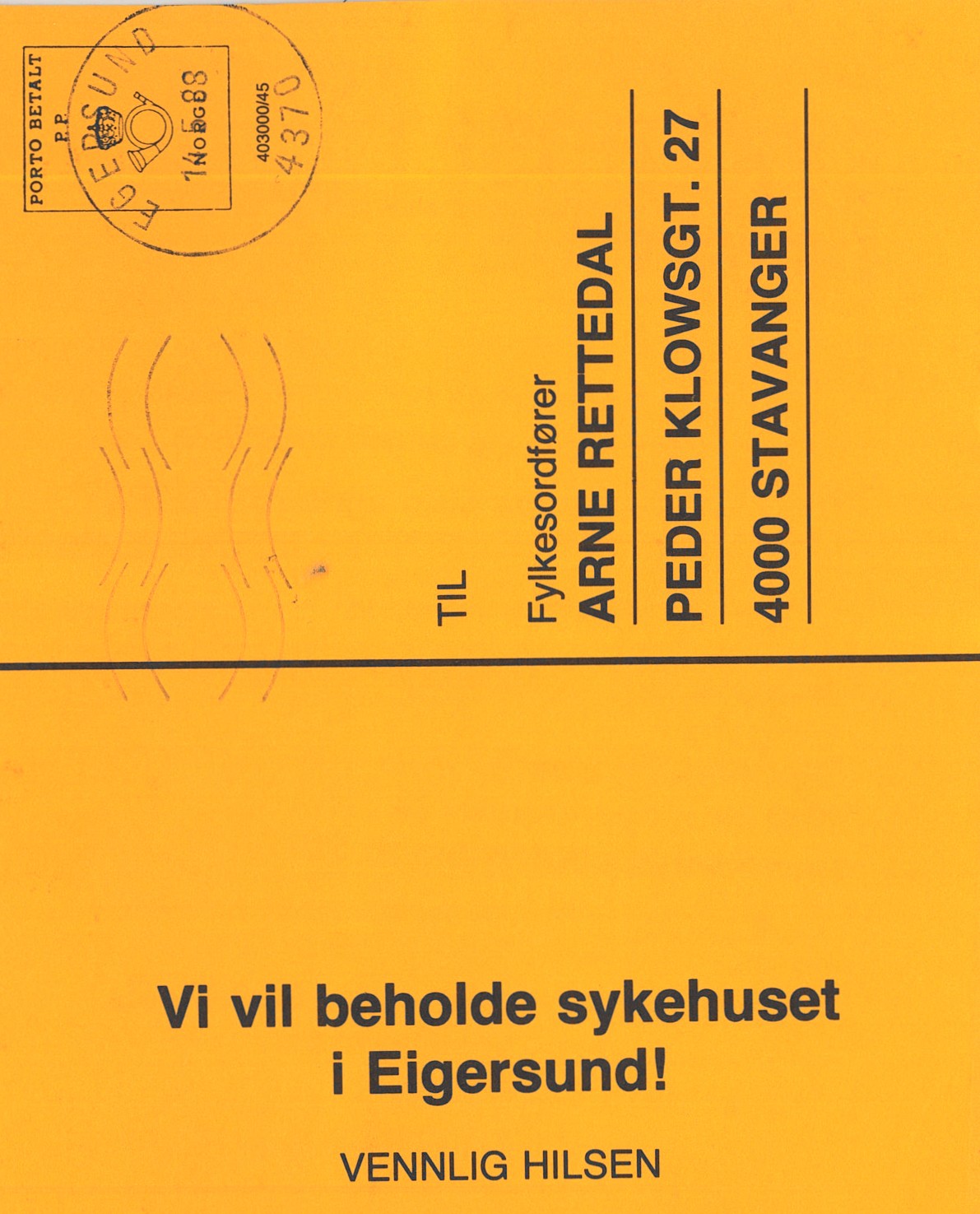I 1988 var sykehuset i Egersund truet av nedlegging. Det ble arrangert aksjoner og protester. Spesiallagde protestkort ble adressert til daværende fylkesordfører Arne Rettedal. På IKA har vi bevart rundt 5000 av de gule protestkortene.